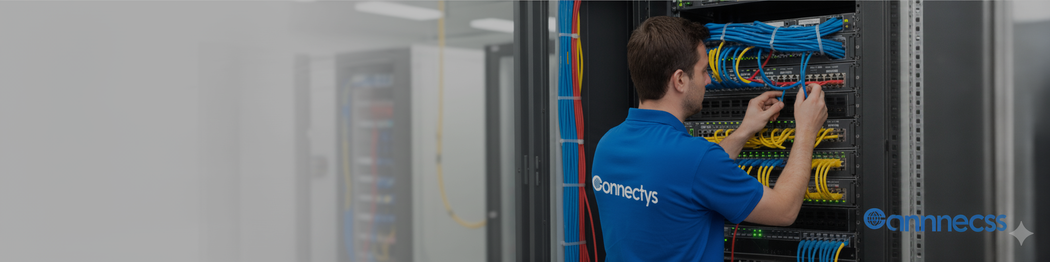 Spécialiste du câblage cuivre RJ45 et fibre intrasite, Connectys conçoit et installe les réseaux internes des entreprises : baies, brassage, routeurs, serveurs, bornes Wi-Fi. Nous assurons la mise en production complète de vos installations LAN avec tests, repérage et certification.